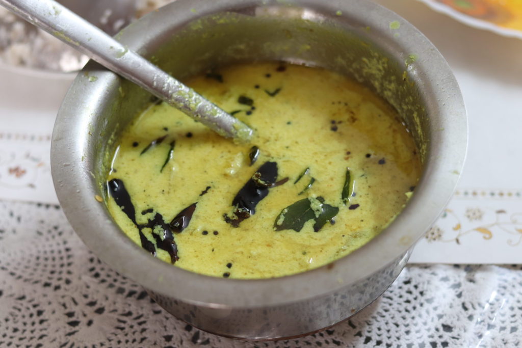 パイナップルの入ったヨーグルトカレー、パイナップル・プリセリのレシピです。パイナップルをスパイスと一緒に煮て、ココナッツのペースト・ヨーグルトと混ぜ合わせます。プリセリという料理を食べたのはこの時が初めてで、名前がかわいい事もあり、てっきり甘いデザートみたいな味を想像していましたが全然違いました。辛味が結構強く、ヨーグルトの酸味が立っていてソリッドな味でした。またインドのパイナップルは繊維質で酸味が強く、ますますエッジがかかっていました。