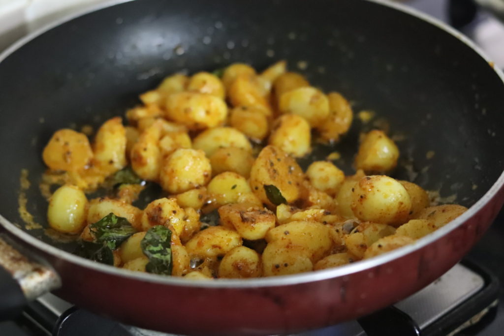 ・ベビーポテト・ターメリック・レッドチリパウダー・塩を入れてさっと混ぜ、弱中火で3分ほど、表面にきつね色の焦げ目がつくまで炒めたらできあがり。