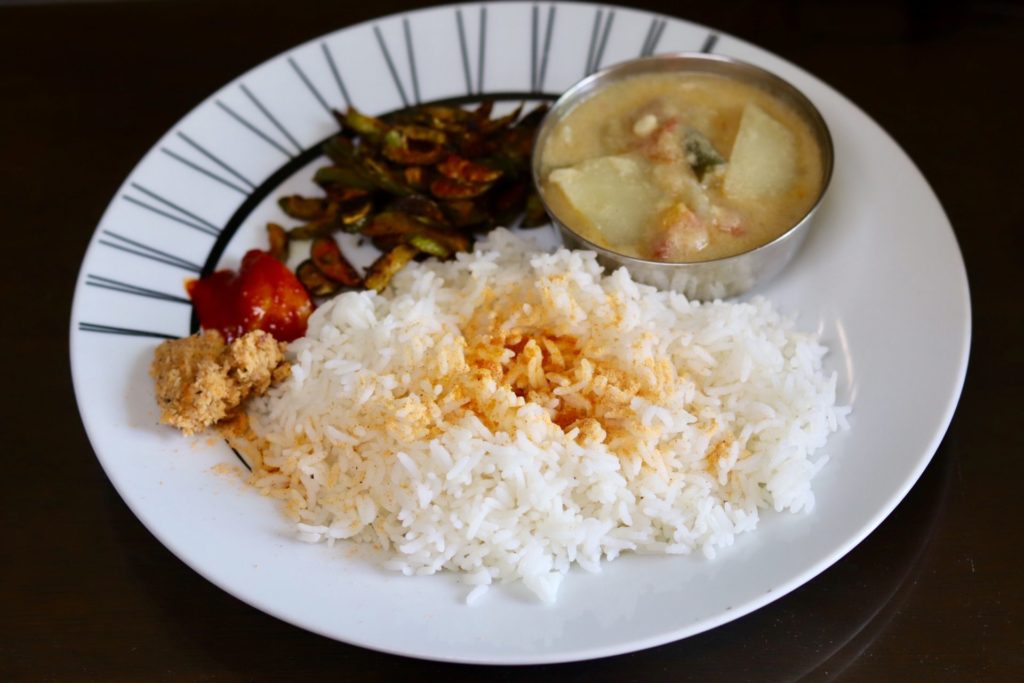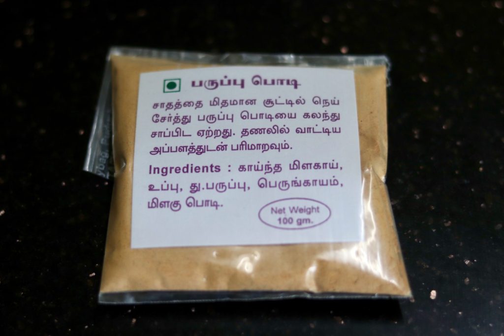 Mylaporeにある食料品店Ganapathy’s Butter & Gheeで買ってきたポディとギーをご飯にかけました。このお店は乾物・ミックススパイス・はちみつなど面白い食料品がいろいろ売っていて楽しかったです。