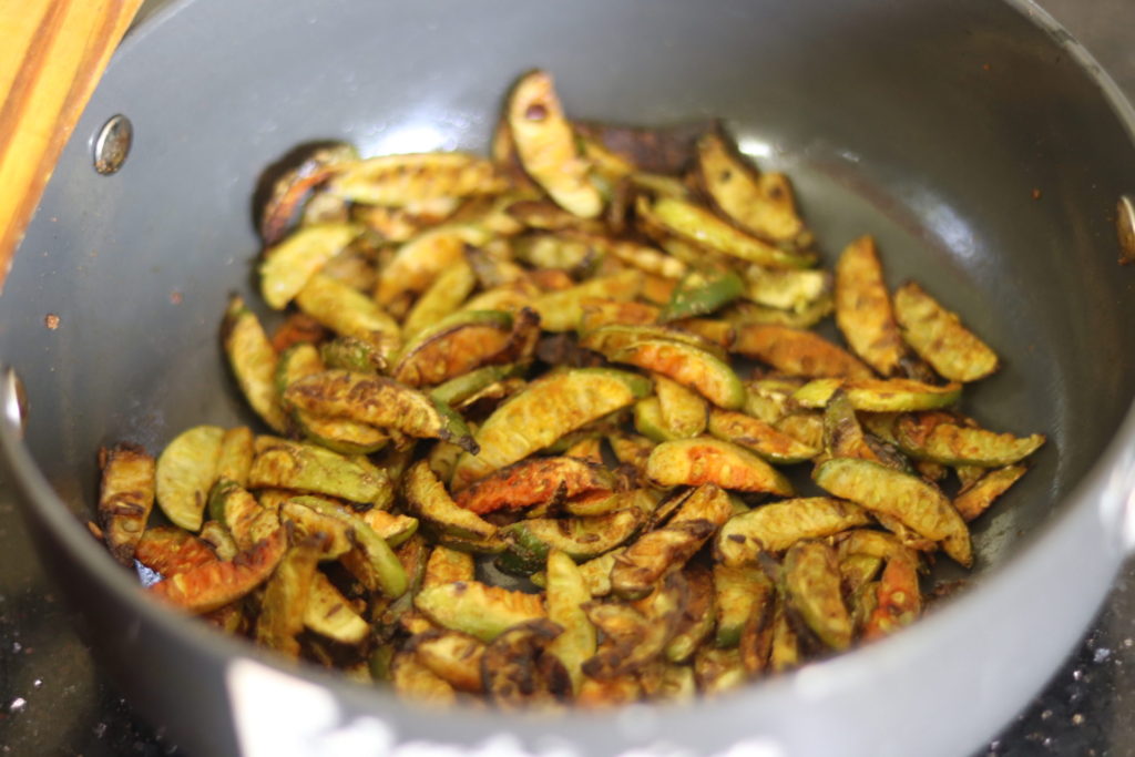 前回切り方でダメ出しをくらったカラスウリ。教室で正しい切り方を教わってきたので再チャレンジです。斜めに2~3mmくらいに薄く切り、パウダースパイスと和えて炒めます。薄くてカリカリになる感じですね。前回のようなコリコリ感はなくなりました。ネットでインドのレシピを調べるといろんな切り方をしているので、どっちがいいかは好みな気もします。前回のカラスウリの記事もリンクしておきます。
