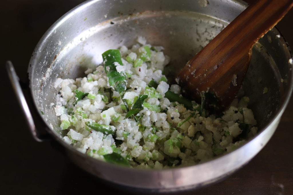 チェンナイ滞在も残り1週間に差し掛かるところで、そろそろ冷蔵庫の中を空けていかなればと思い、残っていたココナッツペーストとラディッシュ(大根)を炒め合わせて白和えみたいな料理を作りました。参考にしたのはポンディシェリーで教わった大根サブジのレシピです。